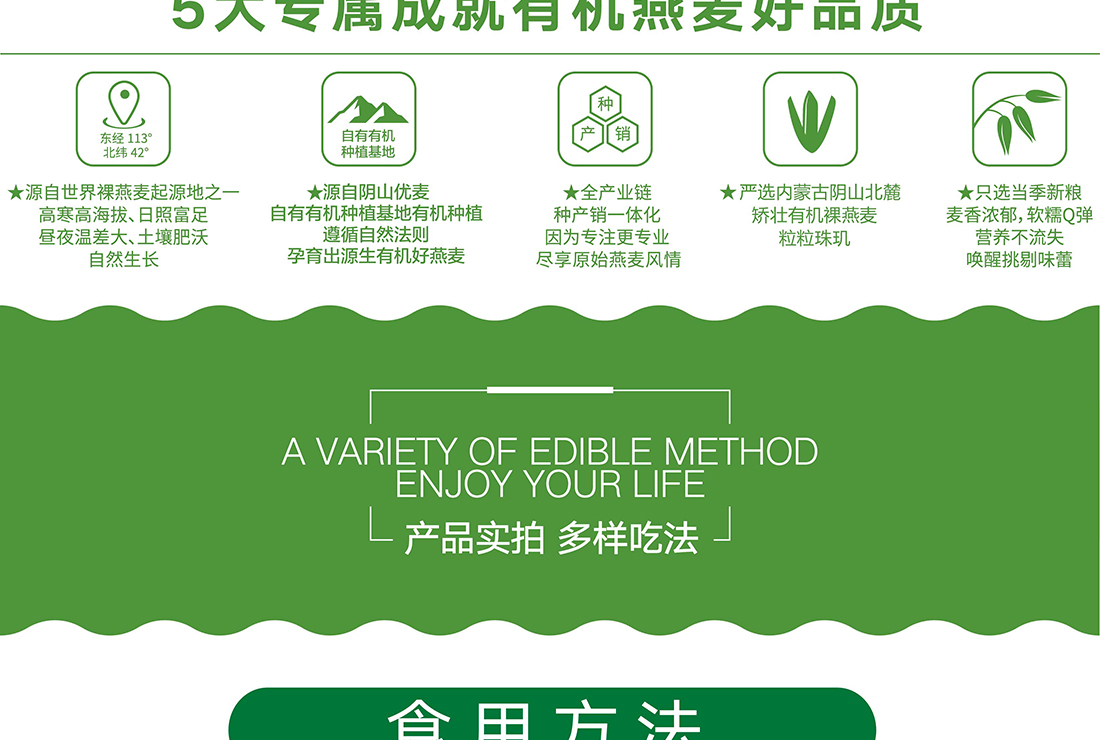 內(nèi)蒙古,世界裸燕麥起源地之一;陰山源生燕麥在初出生滿足生長(zhǎng)規(guī)律一切所需,高寒、高海拔、日照充足;遵循自然法則,靠天滋養(yǎng),自然生長(zhǎng);