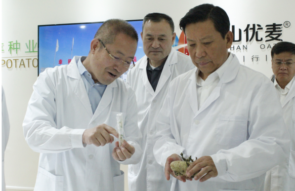 段志強一行首先參觀了民豐種業(yè)脫毒組培中心展廳,詳細了解了馬鈴薯脫毒種薯生產(chǎn)過程及企業(yè)發(fā)展情況。張國介紹,內(nèi)蒙古民豐種業(yè)有限公司成立于2008年,注冊資本1.3億元,已累計完成投資10億元以上,公司已發(fā)展成為集馬鈴薯種薯、訂單薯生產(chǎn)及馬鈴薯、燕麥深加工于一體的全產(chǎn)業(yè)鏈集團化企業(yè),是“農(nóng)業(yè)產(chǎn)業(yè)化國家重點龍頭企業(yè)”、“國家高新技術企業(yè)”、“自治區(qū)扶貧龍頭企業(yè)”。目前,公司已發(fā)展成為一家融合農(nóng)業(yè)和食品加工業(yè)的全產(chǎn)業(yè)鏈集團化公司,形成以食品加工帶動農(nóng)業(yè),以農(nóng)業(yè)服務食品加工,一、二、三產(chǎn)融合、農(nóng)商互聯(lián)齊頭并進的良性發(fā)展業(yè)務格局。